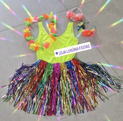 Fantasia Carnaval adulto colorido feminino, sugestão de peças: body, bory, colar Havaiano, saia e tiara. Consulte-nos para maiores informações.