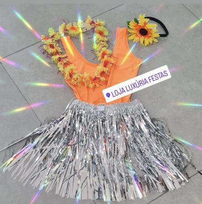 Fantasia Carnaval adulto laranja feminino, sugestão de peças: body, bory, colar Havaiano, saia e tiara. Consulte-nos para maiores informações.
