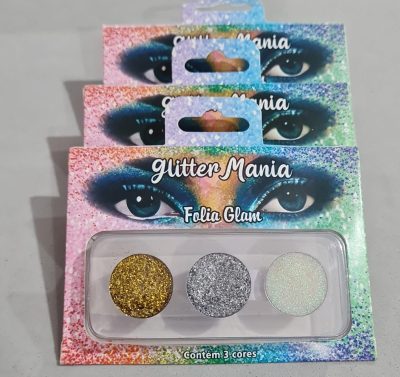 Paleta glitter com 3 cores, Rostinho pintado. Consulte-nos para maiores informações.