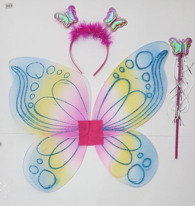 Kit asa borboleta colorida infantil acompanha tiara e bastão. Consulte-nos para maiores informações.