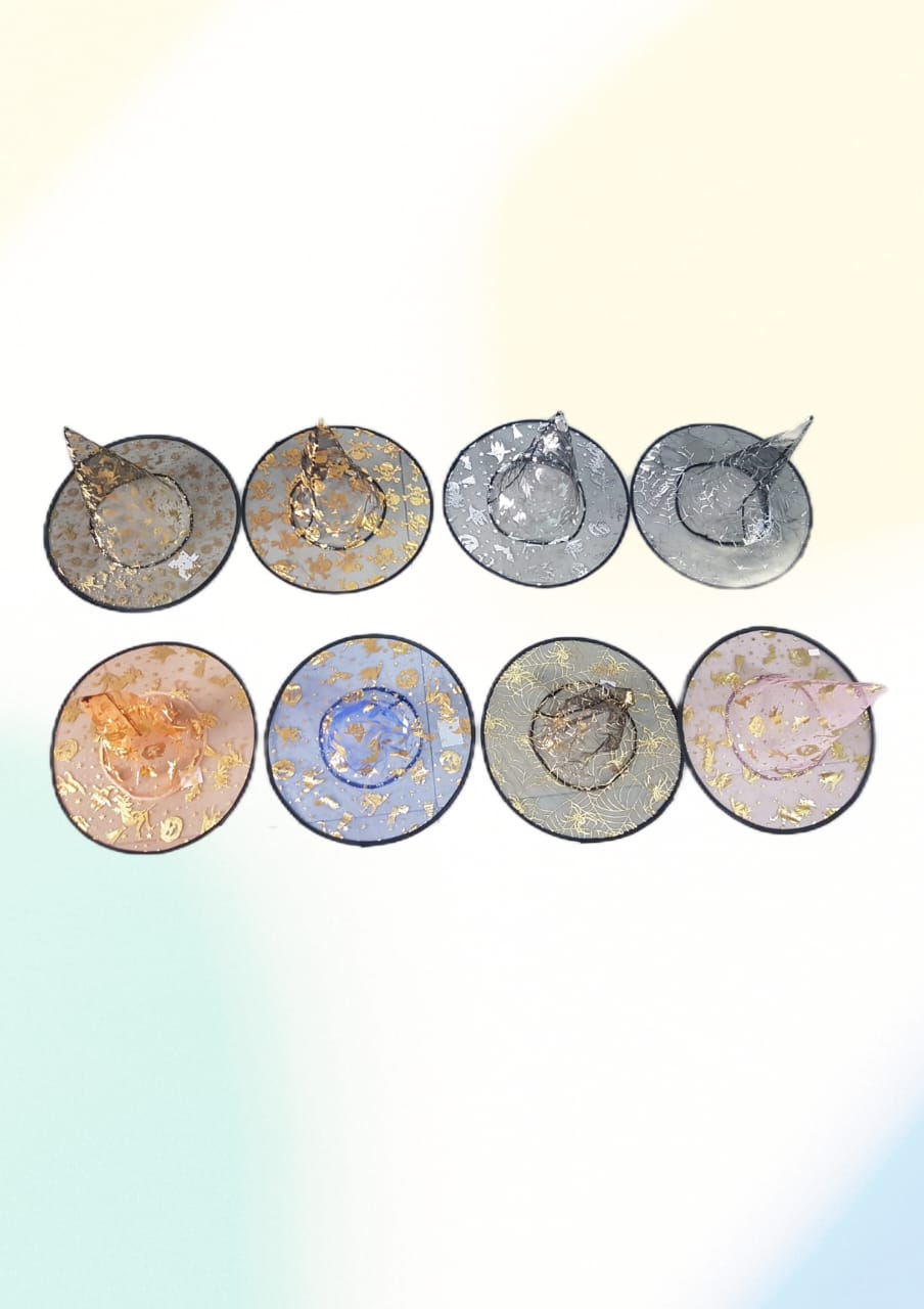Chapéus de bruxa simples com diversas cores, desenhos e corpo transparente. Consulte-nos para maiores informações.