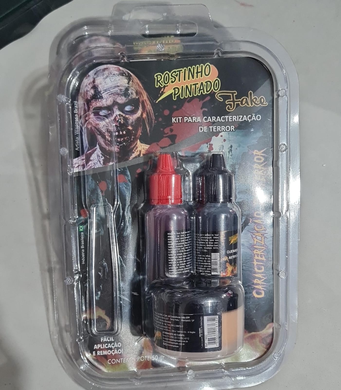 Kit caracterização de terror: 1 pote massa 50g; 2 bisnagas sangue artificial 15ml; 1 espátula, maquiagem artística Halloween. Consulte-nos para maiores informações.