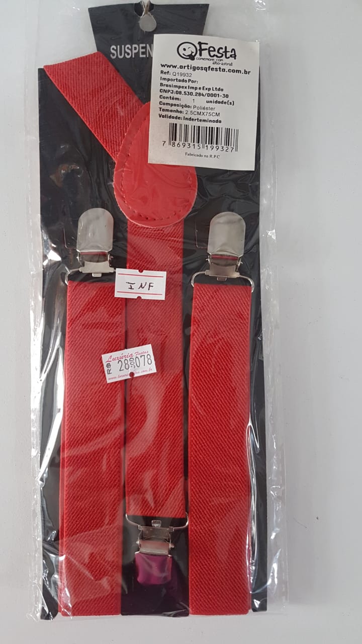 Suspensório infantil na cor vermelho, composição poliéster. Consulte-nos para maiores informações.
